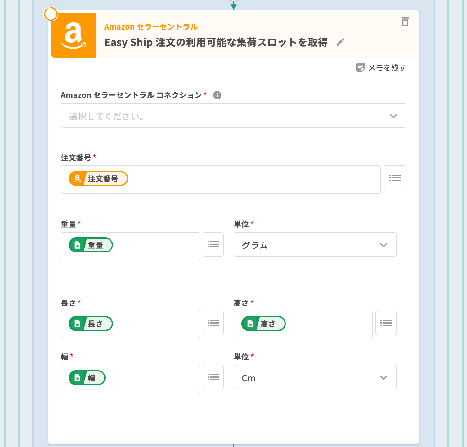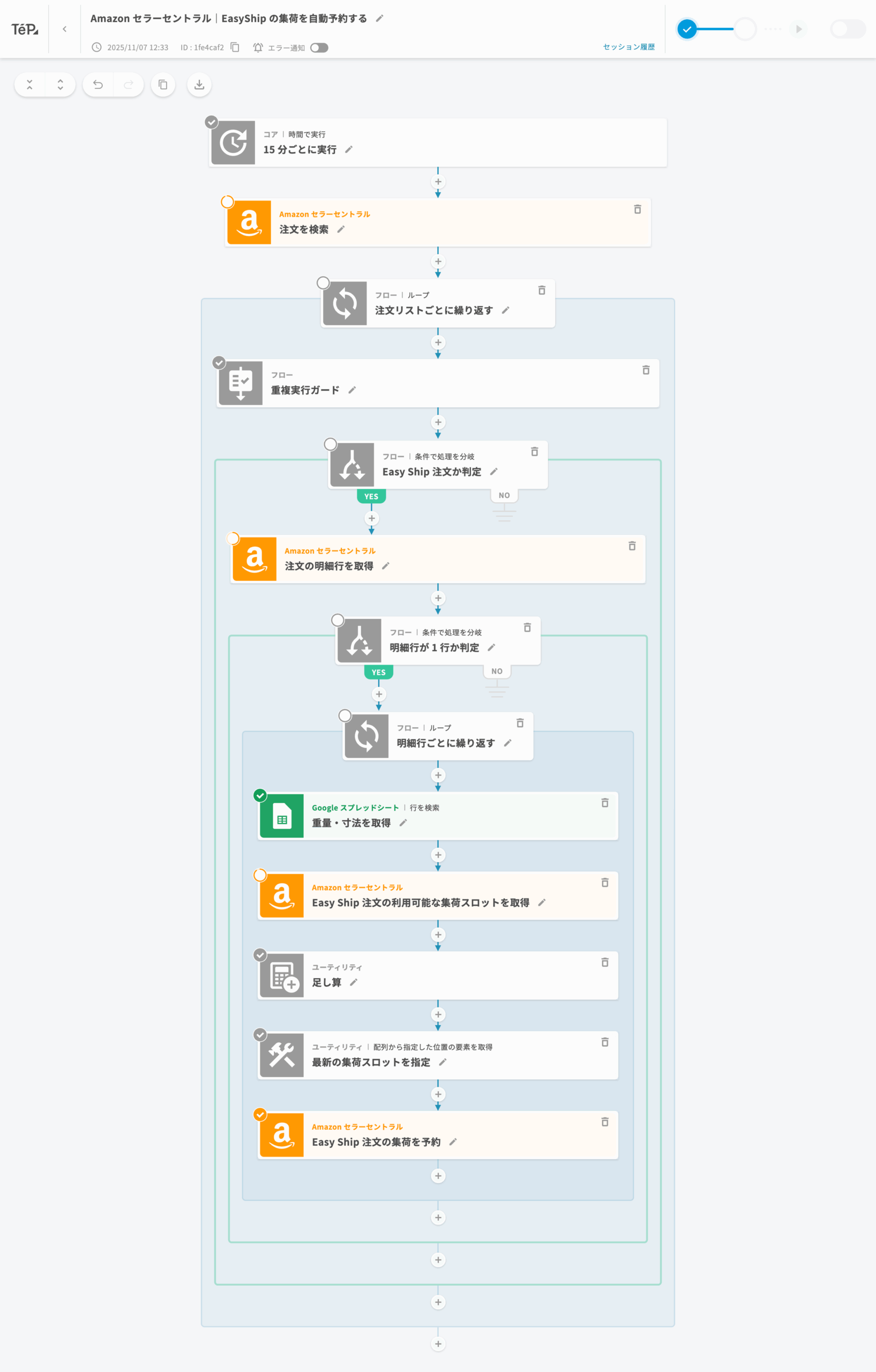 取得してきた注文が Easy Ship 対象か判定し、Google スプレッドシートから寸法と重量を取得。Amazon に情報を戻しつつ、集荷予約を完了します。