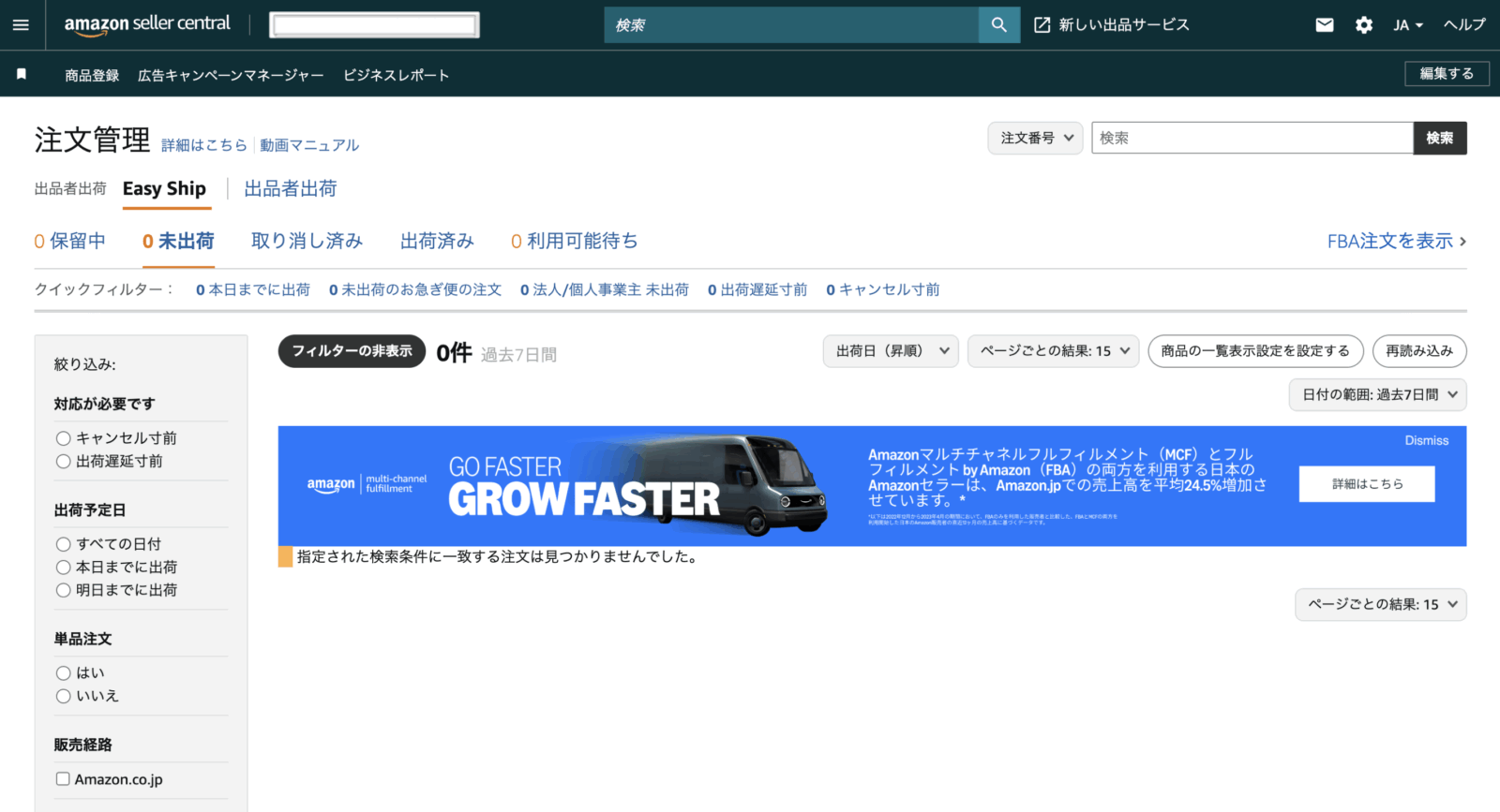一方で、Easy Ship は通常の注文とは別の画面で管理されており、出荷までのオペレーションも異なります。そのため、通常の自己発送と併用する場合、業務の流れが複雑になったり、担当者が操作画面を行き来する手間が発生することもあります。