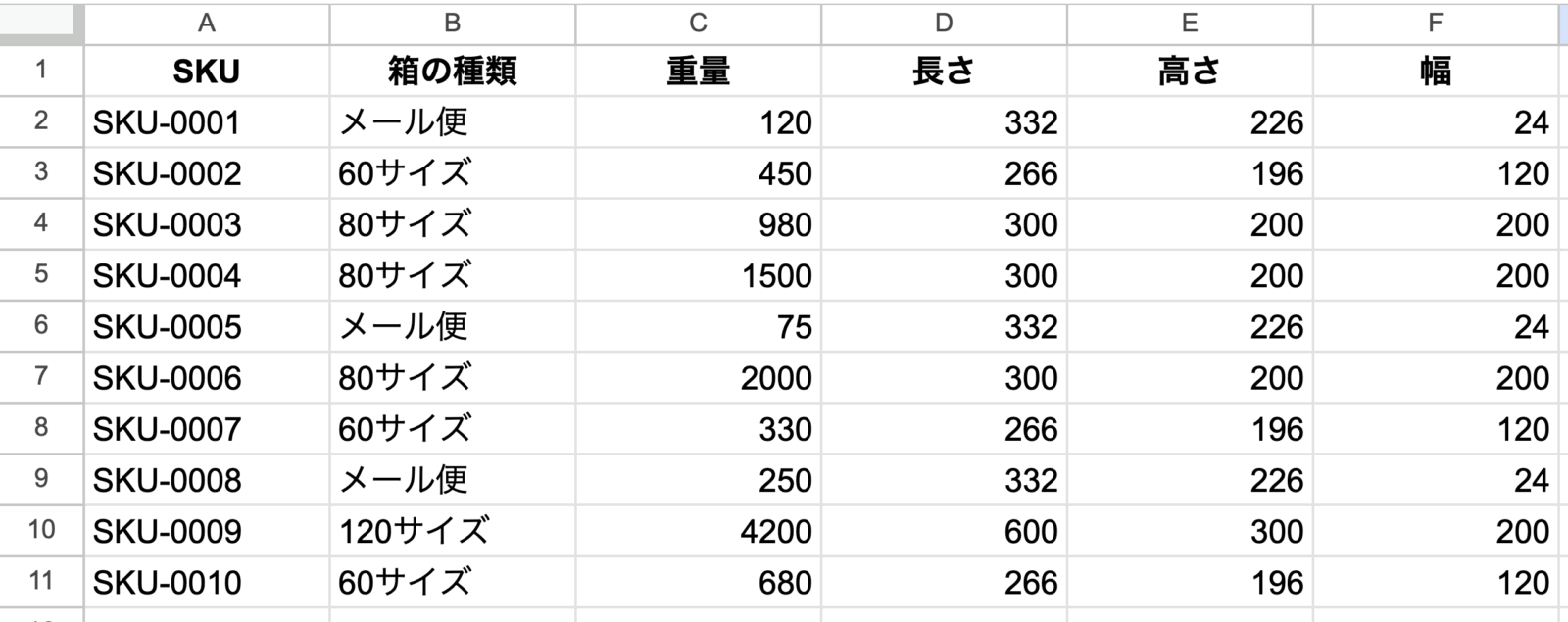 Google スプレッドシートに、SKU ごとの寸法と重量を一覧にしておきます。重量はそれぞれ異なりますが、寸法は箱のサイズを入力すればよいので、ある程度コピペできると思います。